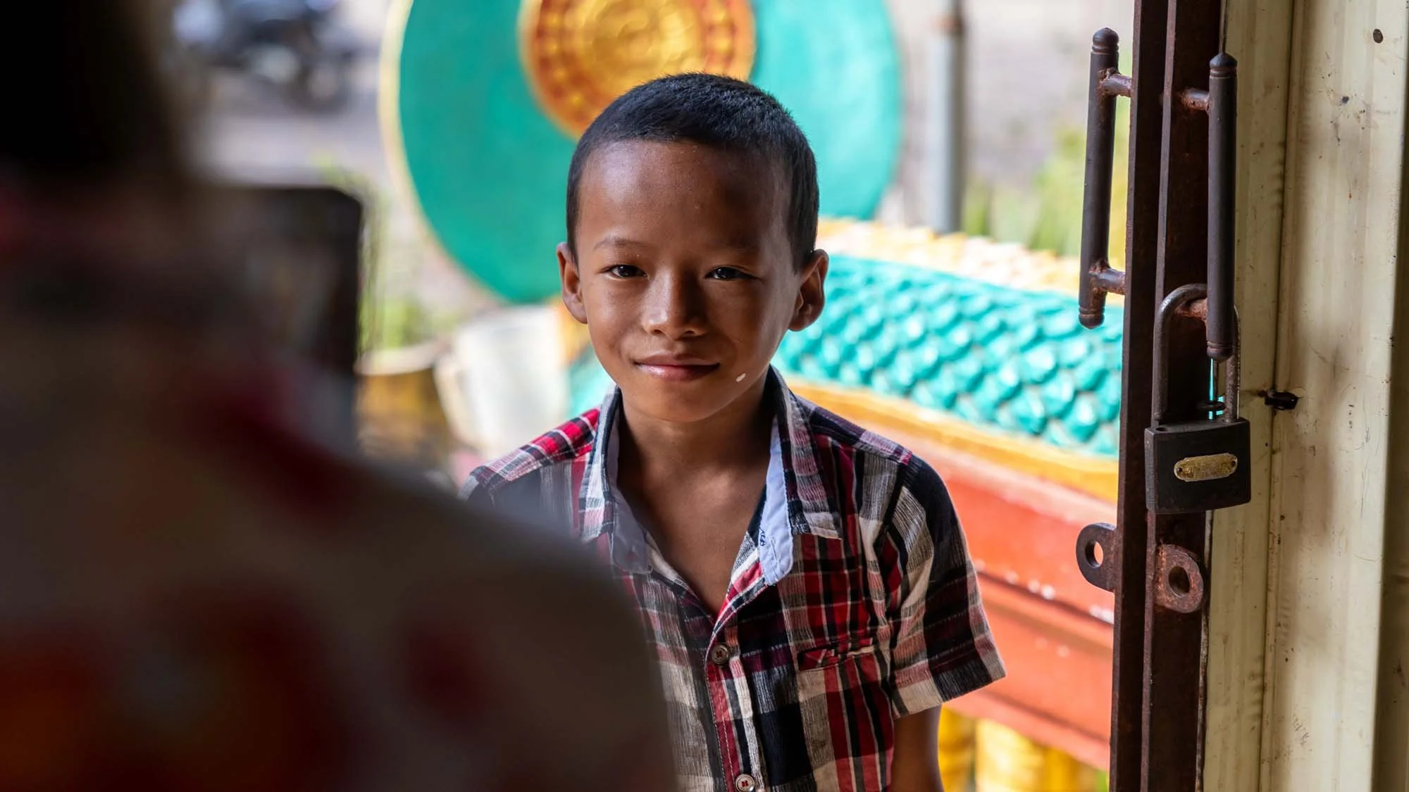 Portrait of an Asian man with short hair, wearing a dark button-up shirt, outdoors with green foliage in the background.