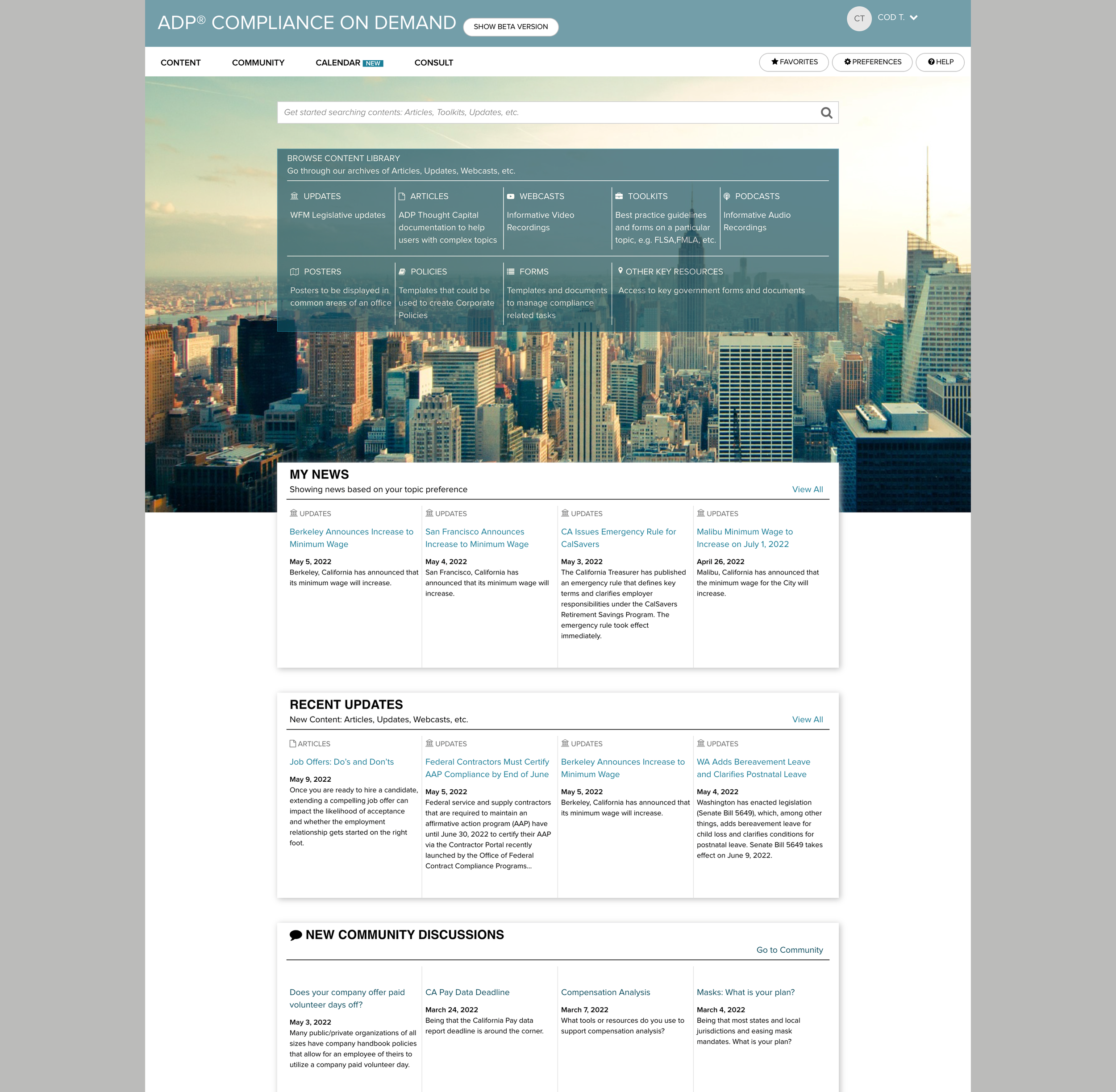 Challenge: Redesign Compliance on Demand to migrate to a new CMS, align with ADP’s OneUX system, and create cohesion with Workforce Now.