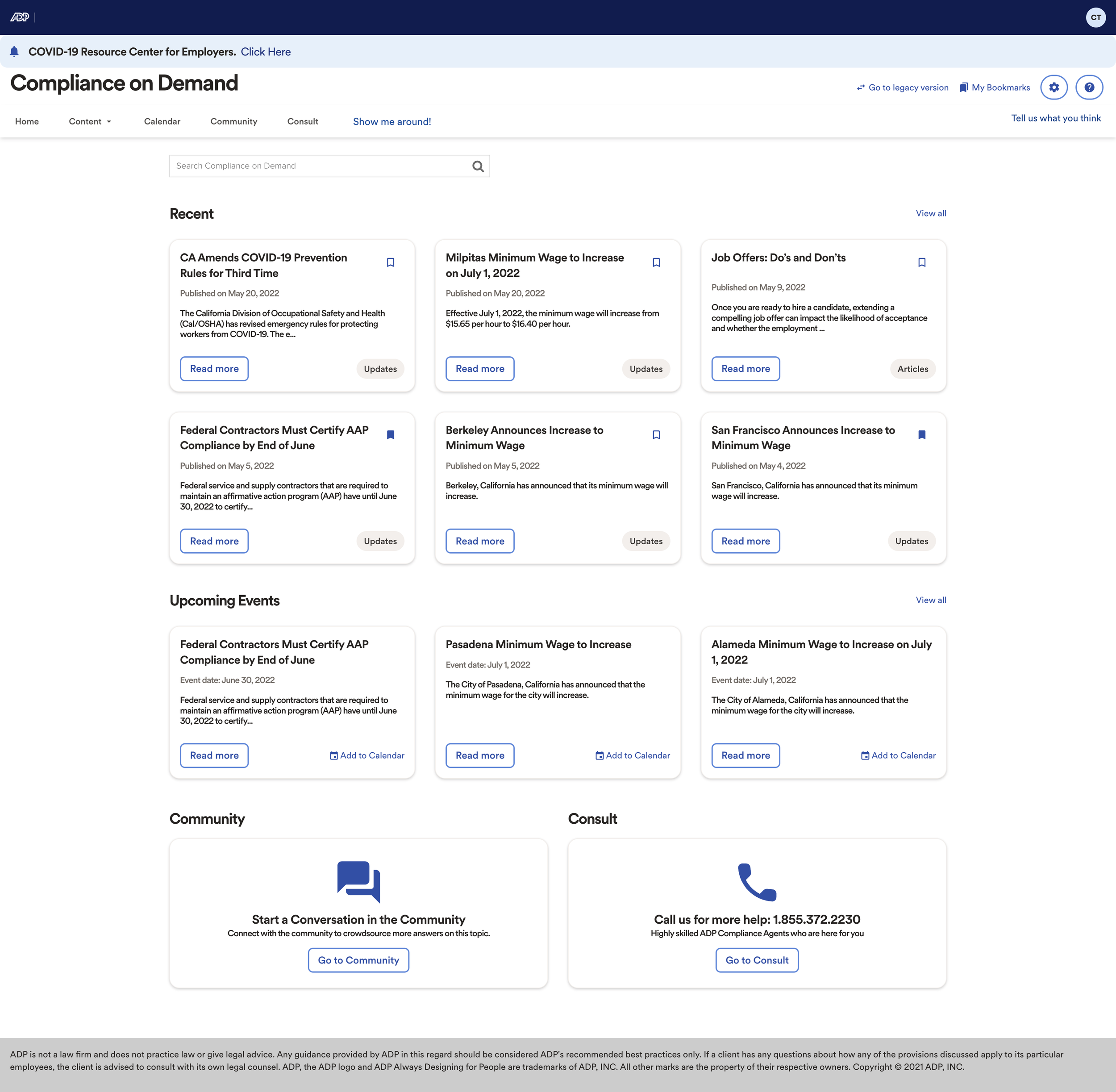 New Compliance On Demand homepage. Used ADP’s new design system components with simplified UI increased engagement and reduced time needed to find valuable content.