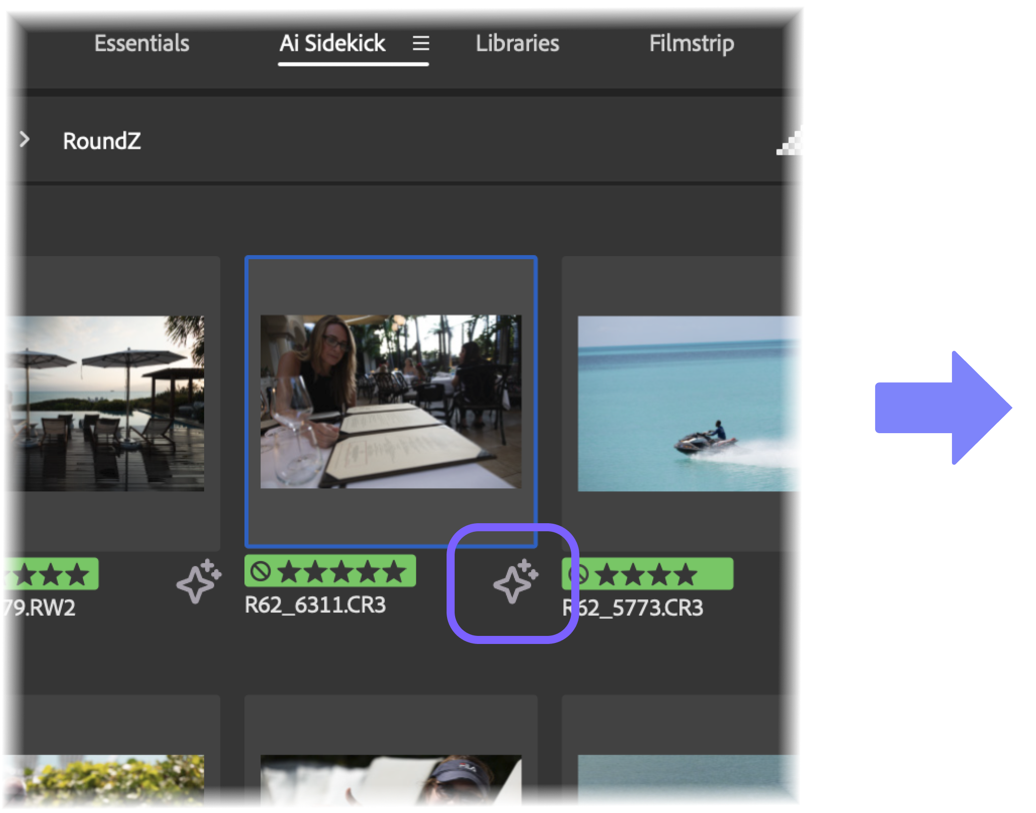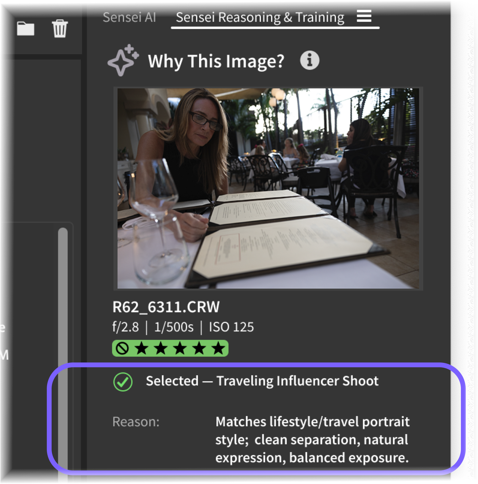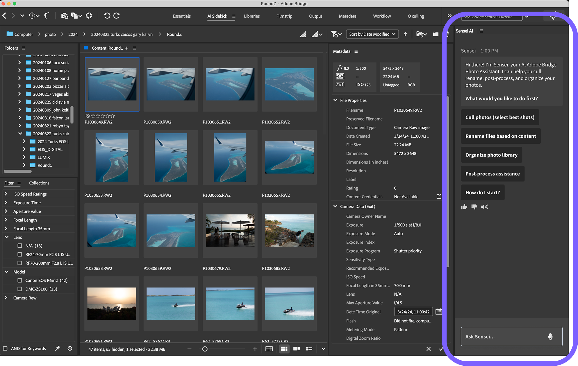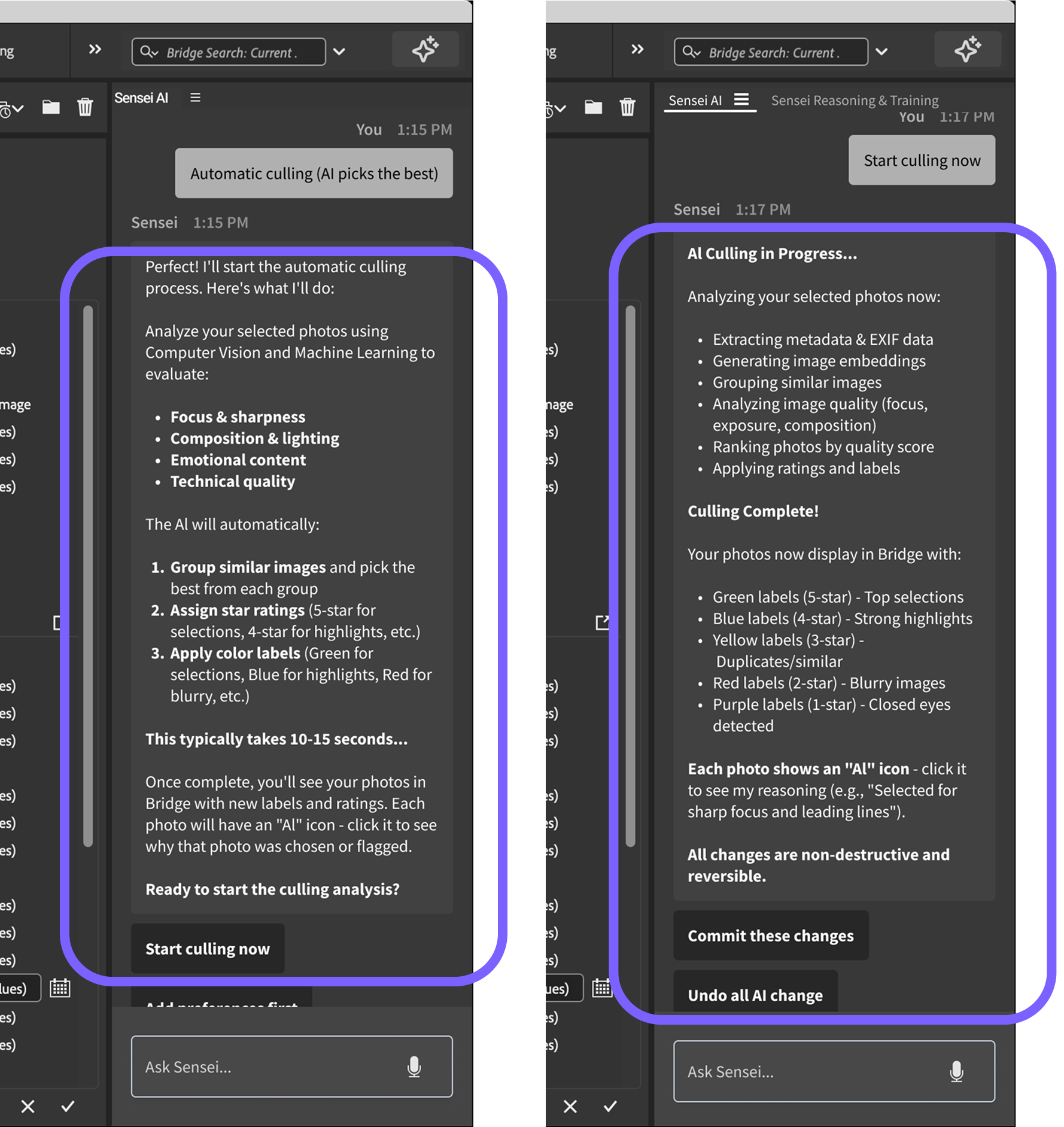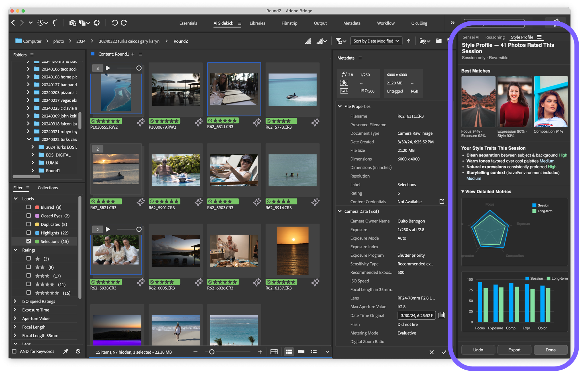 An AI side panel in Adobe Bridge that learns a photographer’s style and explains its reasoning.