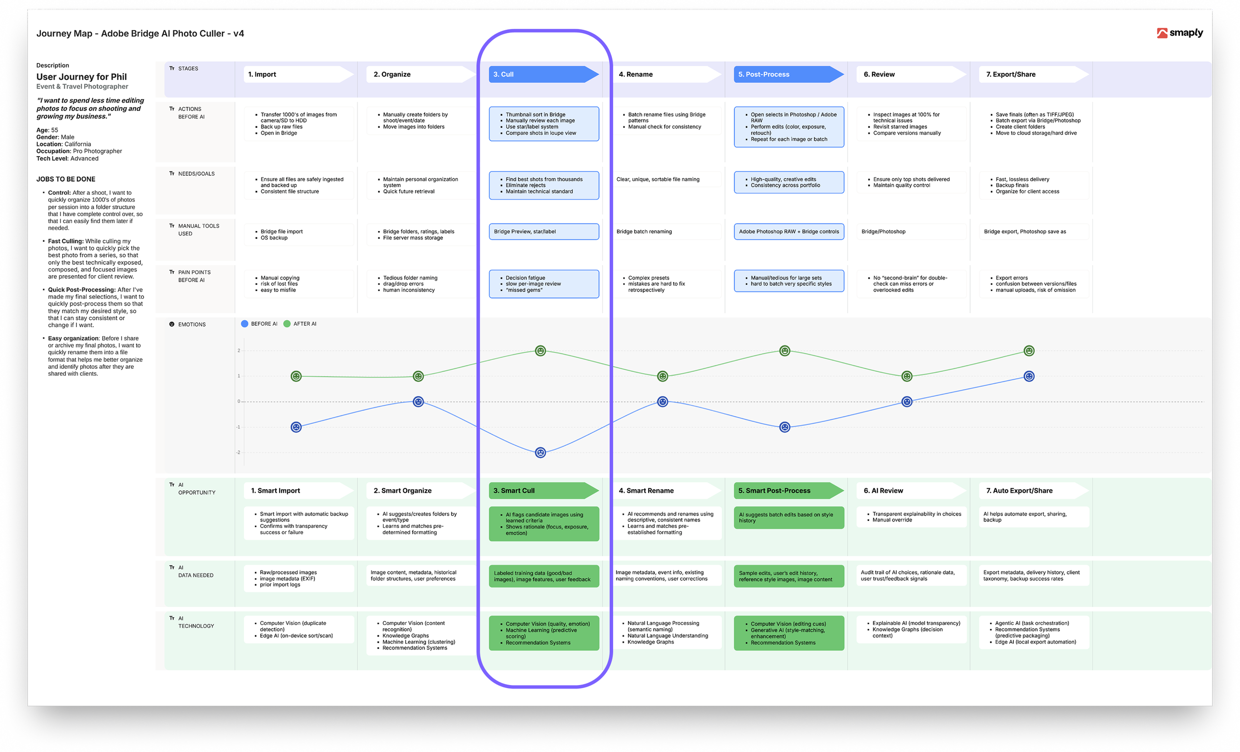 Below: I focused on Stage 3 - Culling (in purple highlight), as research indicated it was a major pain point that significantly impacted ROI related to users' emotions before and after AI implementation.