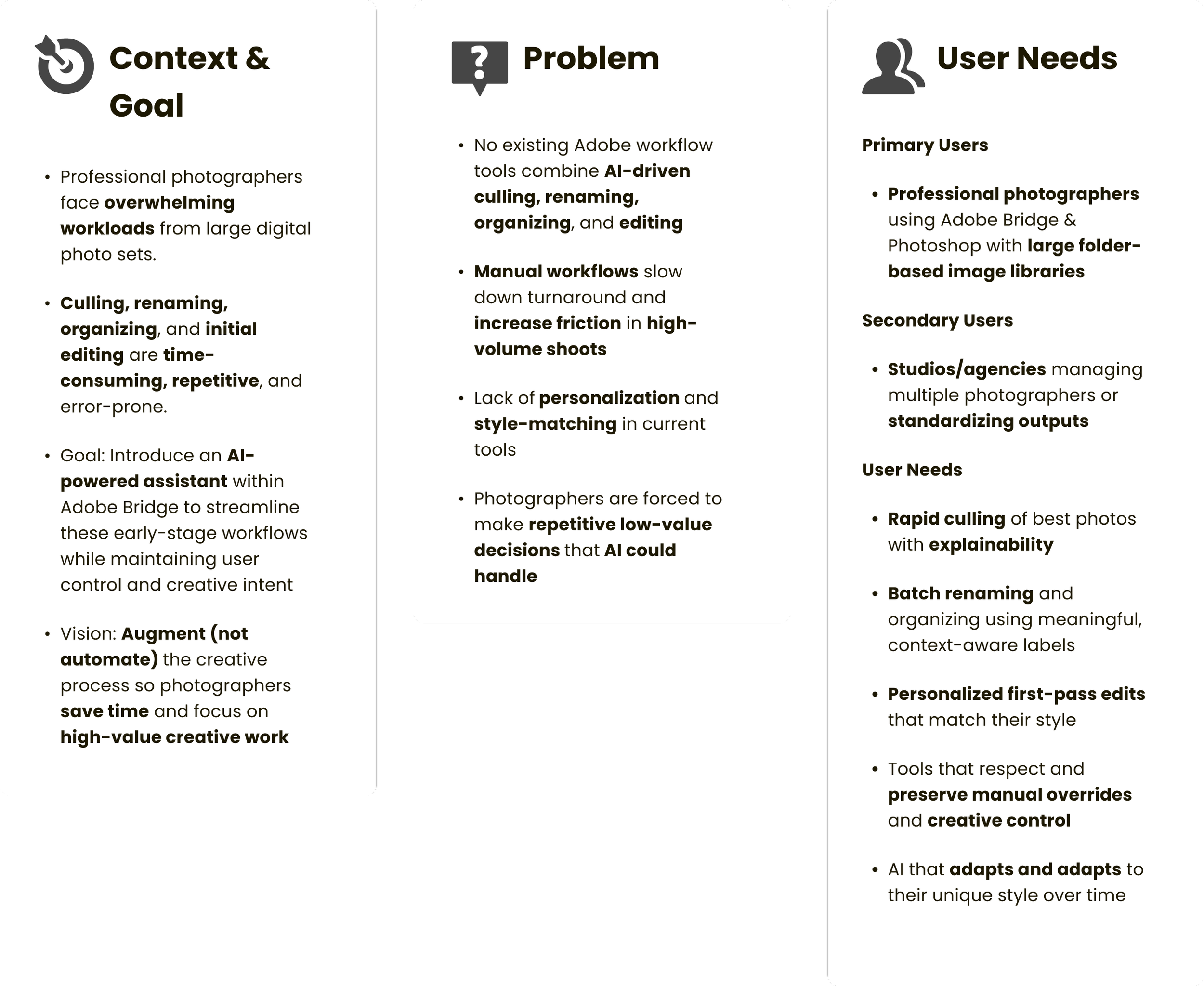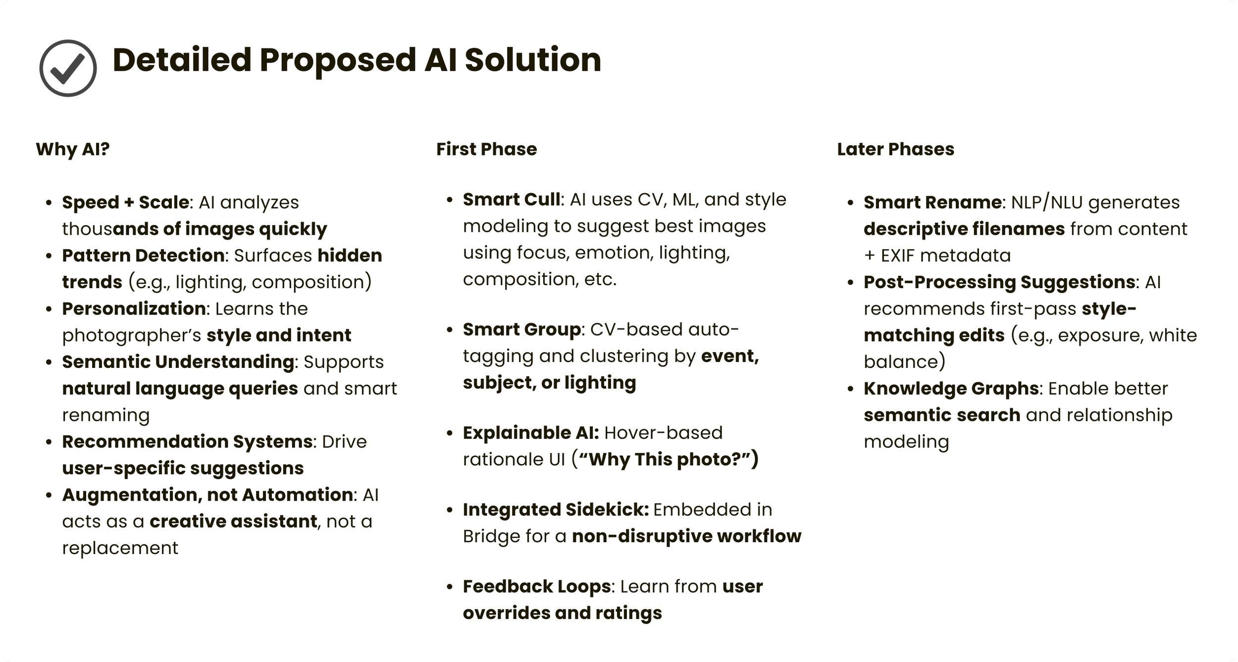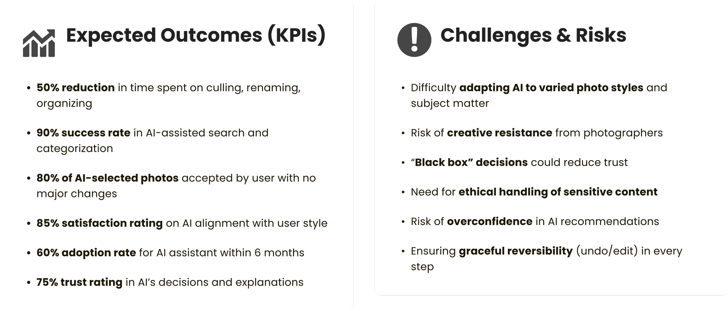 Impact (Target Outcomes): Concept demonstrated how AI could save photographers significant time while maintaining trust and creative control, with projected gains in efficiency, accuracy, and user confidence.
