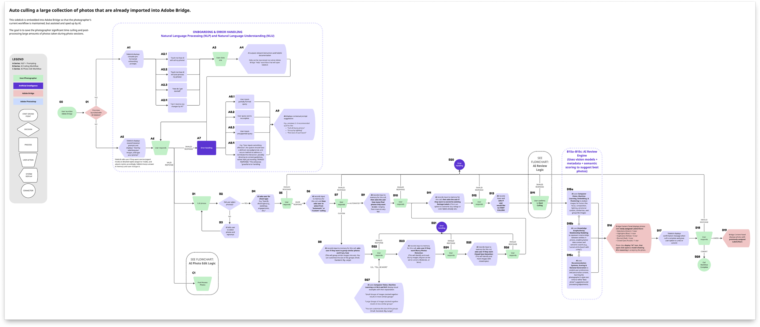 Below: Conversational flowchart show the conversational logic for a user culling photos, and connects to the other two flowcharts below.