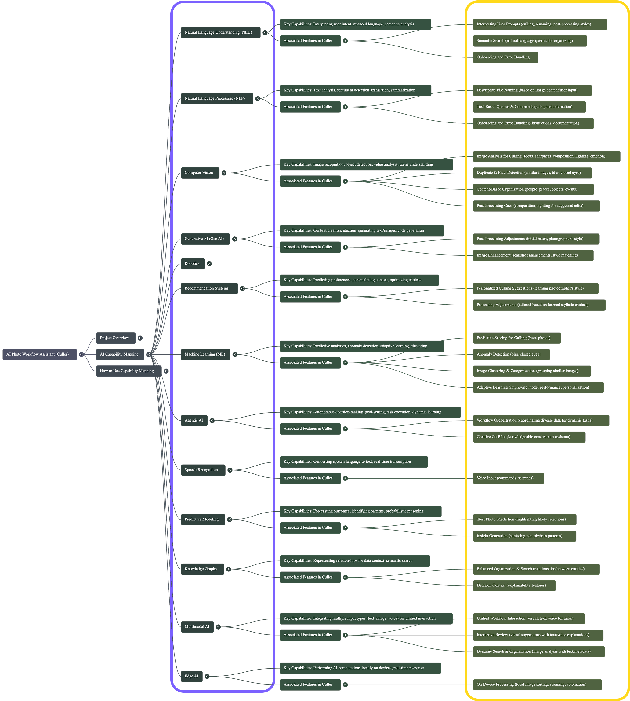 NotebookLM parsed data for AI Capability Mapping, aligning the photo culler's features with relevant AI technologies. Our lesson plans covered various AI technologies, giving examples for each. With NotebookLM, I created the mind map below, and even more detail shows my AI Capability Map Matrix document.